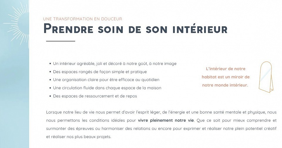 Notre habitat n’est pas seulement un lieu pour vivre en famille, se ressourcer, répondre à nos différents besoins… Il porte une énergie, une vibration avec une personnalité unique. Celle de ses habitants. C’est un espace vivant qui évolue avec nous, en miroir de notre propre intérieur. Lorsqu’on se sent pleinement en phase avec son chez soi, qu'on l'habite vraiment, on se sent bien aussi en soi et dans sa vie. La Voie que je vous propose est celle de l'intérieur, par l’habitat mais aussi celle de l’habitant. Pour être plus à l'écoute de son propre espace, lui donner sa dimension, habiter sa maison et en prendre soin.